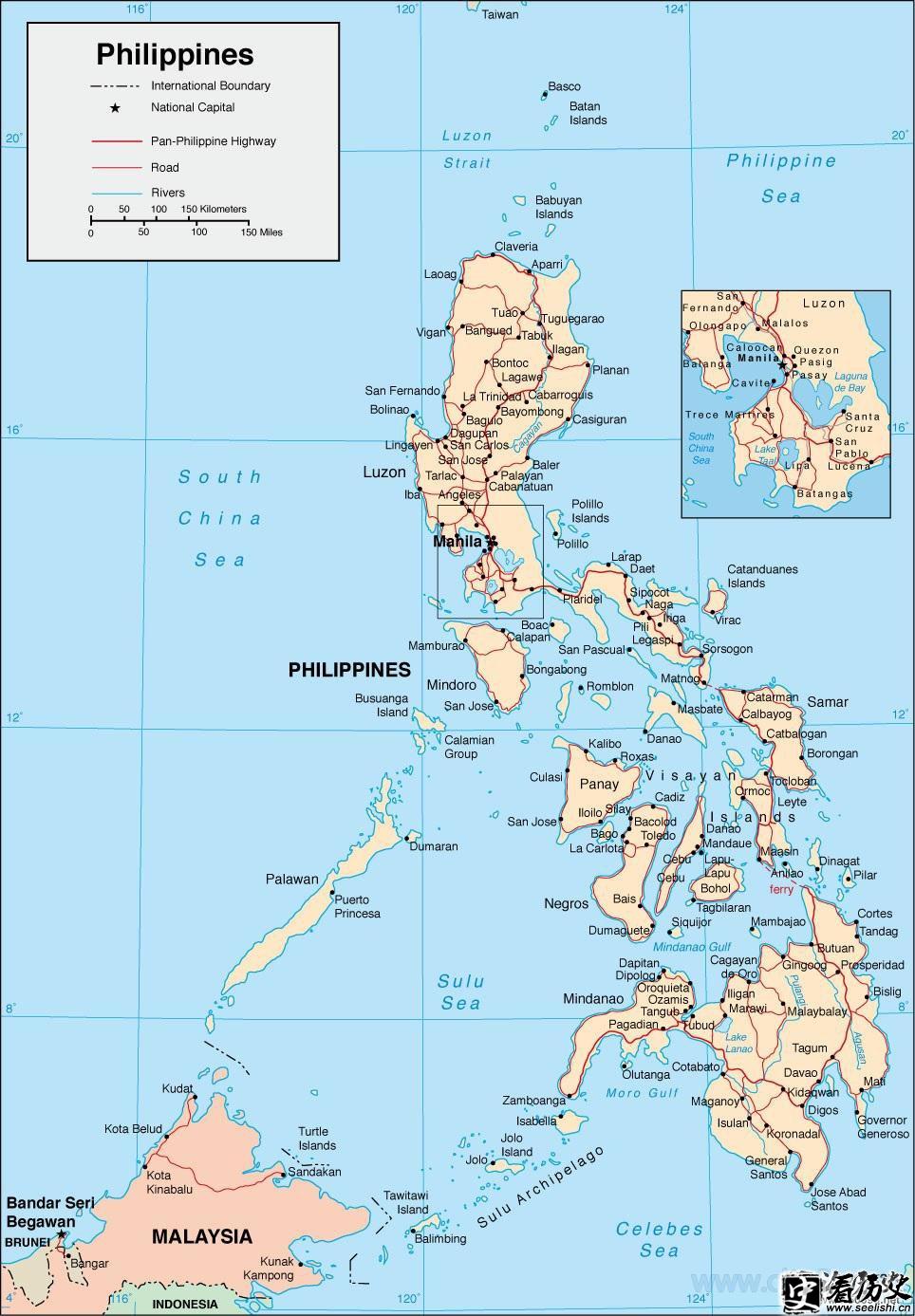 西班牙航海家R.洛佩斯·德·维拉洛博斯于1543年到达该地,以西班牙皇太子菲利浦之名命名该群岛为菲律宾,菲律宾北隔巴士海峡与中国台湾省相对,东濒太平洋,西临南海,南隔海与印尼、马来西亚为邻,共有大小岛屿7107个,面积为299681平方公里,主要是马来人,少数民族有印尼人、华人、阿拉伯人、西班牙人等,官方语言为英语和菲律宾语,83.8%的居民信奉天主教,首都马尼拉市。
