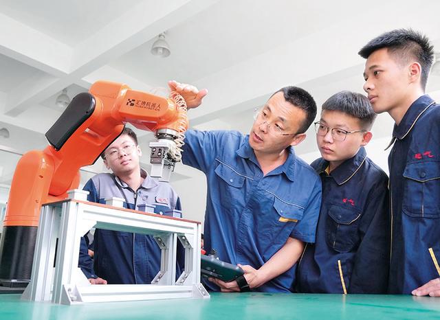 河北省秦皇岛工业职业技术学院的老师(右三)给电气工程专业学生讲解机器人的工作原理(2023 年 6 月 13 日摄) 杨世尧摄 / 本刊