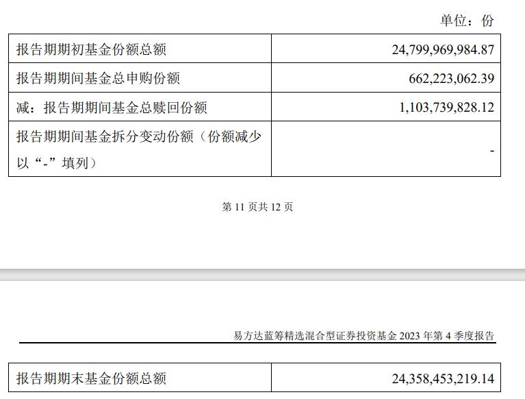 基金 2023 年四季报持续披露,记者注意到,易方达张坤管理的多只基金在四季度出现净赎回,比如易方达蓝筹精选混合,单季度赎回份额超 11 亿份,不过同时也有超 6 亿份的申购。