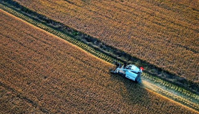 在西安市长安区王曲街道皇甫村,收割机在收割水稻(2022 年 10 月 21 日摄,无人机照片)。新华社记者 刘潇摄
