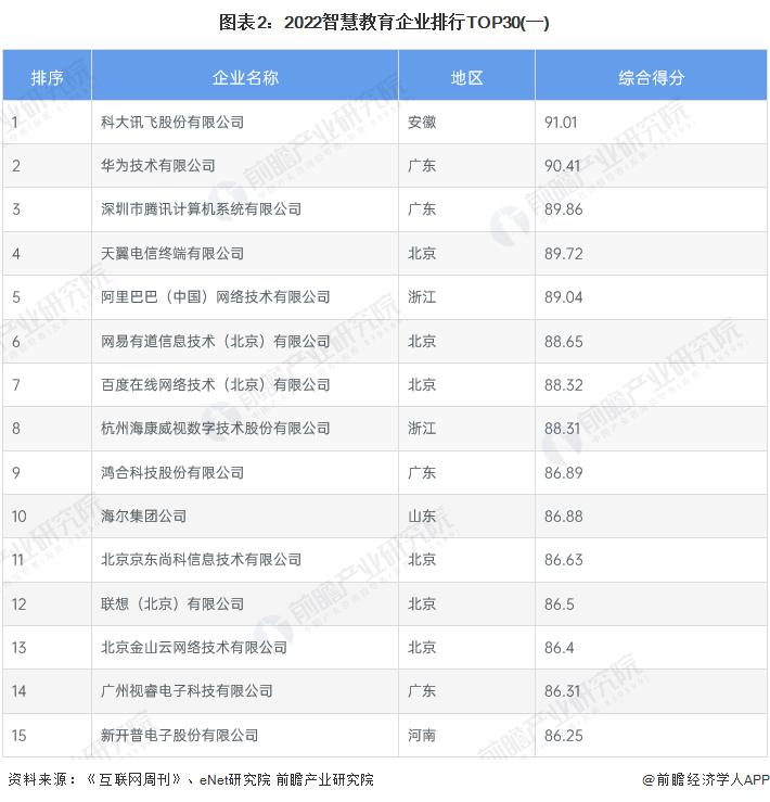 根据中科院《互联网周刊》联合德本咨询、eNet 研究院共同发布的 2022 智慧教育企业排行,我国包括华为、腾讯、阿里巴巴在内的多家产业数字化厂商入围,其中科大讯飞拔得头筹,成为了 2022 年我国智慧教育领域最有代表性的厂商。