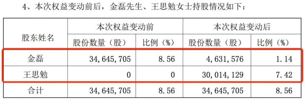 本次权益变动后,金磊持有公司约 1.14% 股份,不再是公司持股 5% 以上股东;王思勉持有公司约 7.42% 股份。