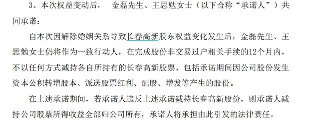 而金磊宣布离婚之后,市场也对是否减持产生了疑问。公告显示,自本次因解除婚姻关系导致长春高新股东权益变化发生后,金磊、王思勉仍将作为一致行动人,在完成股份非交易过户相关手续的 12 个月内,不以任何方式减持各自所持有的长春高新股票,包括承诺期间因公司股份发生资本公积转增股本、派送股票红利、配股、增发等产生的股份。在上述承诺期间,若承诺人违反上述承诺减持长春高新股份,则承诺人减持公司股票所得收益全部归公司所有,承诺人将承担由此引发的法律责任。