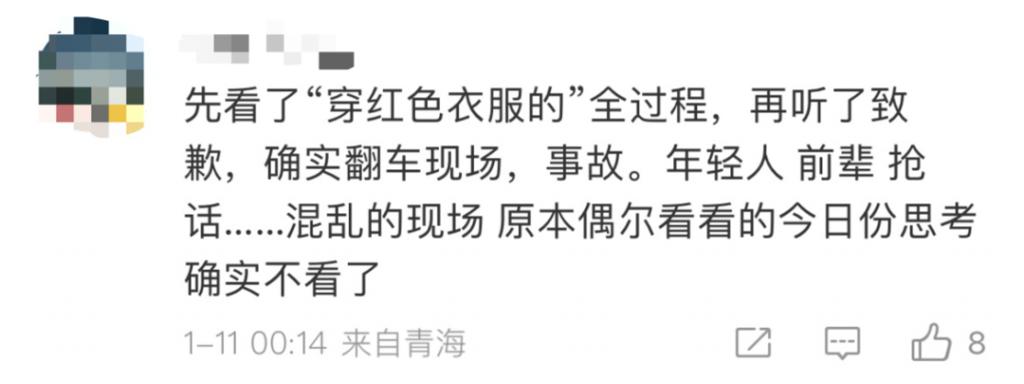 最后,程前说道," 我希望明年,我还能见到几位老师,穿红衣的,这么长时间的岁月都没有让他的性格变得收敛,因此我对 2024 年他性格收敛我不抱任何希望,但是穿保守颜色衣服的,我希望他延年益寿、健健康康、长长久久。"