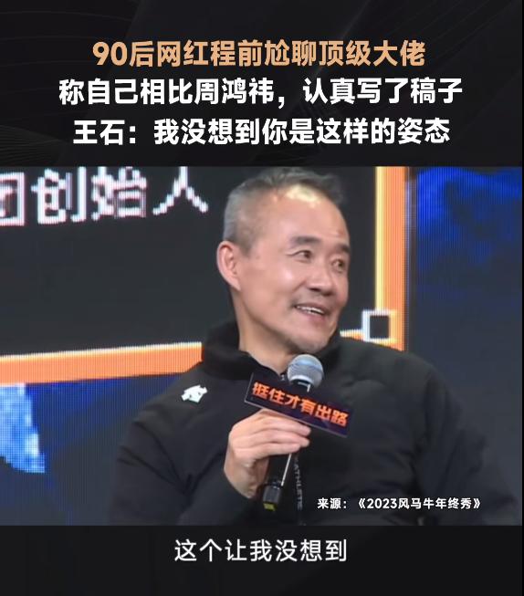 1 月 5 日,"2023 年风马牛年终秀 " 在北京落下帷幕,在圆桌论坛环节," 程前朋友圈 " 主理人程前作为主持人,与冯仑、王石、周鸿祎三位嘉宾进行对谈时发生互怼,引发网友热议。