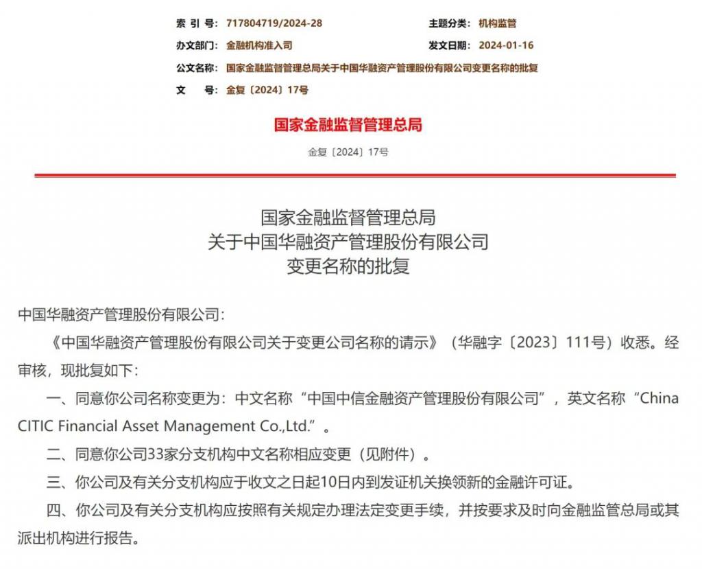 1 月 19 日,国家金融监督管理总局官网公布有关批复称,同意中国华融资产管理股份有限公司(下称 " 中国华融 ")名称变更。据批复,中国华融变更后的中文名称为 " 中国中信金融资产管理股份有限公司 "(下称 " 中信金融资产 "),英文名称为 "China CITIC Financial Asset Management Co.,Ltd."。