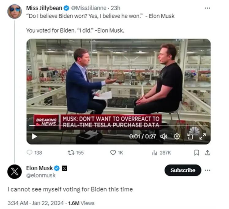 在这则帖子中,一个名为 "Miss Jillybean" 的 X 账号 21 日分享了一段马斯克 2023 年 5 月接受 CNBC 采访的视频。CNBC 主持人在采访中提到 2020 年美国总统选举,并称马斯克当时把票投给了拜登。马斯克承认了这一点:" 我是这么做的。