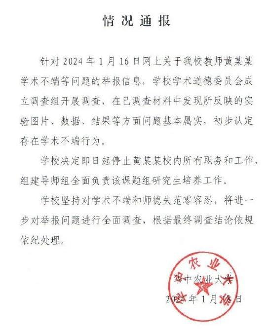 19 日凌晨,华中农业大学发布通报,初步认定黄某某存在学术不端行为,即日起停止黄某某校内所有职务和工作。虽然华中农业大学快速启动了调查程序,但公众仍十分关注事情后续发展。