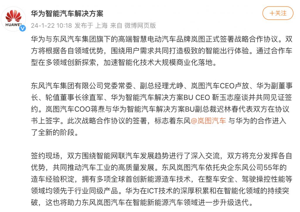 - 华为车BU与东风岚图合作,将采用华为智能技术