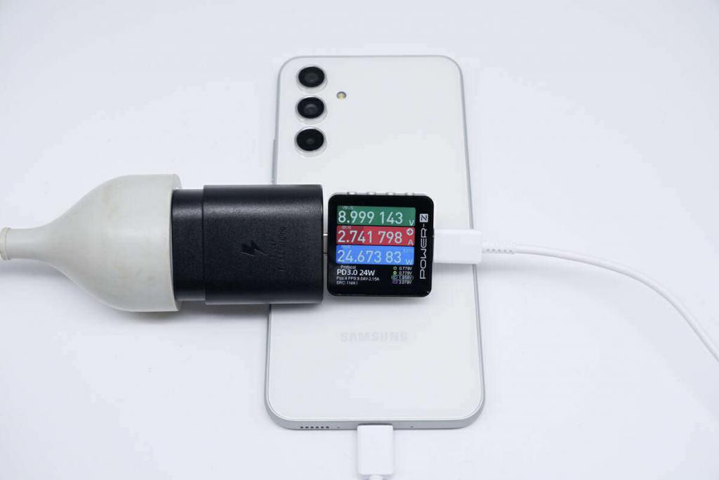 使用原厂充电器搭配原厂充电线为 三星 Galaxy A54 充电使用 POWER-Z KM003C 实测功率为 9.00V 2.74A 24.67W。