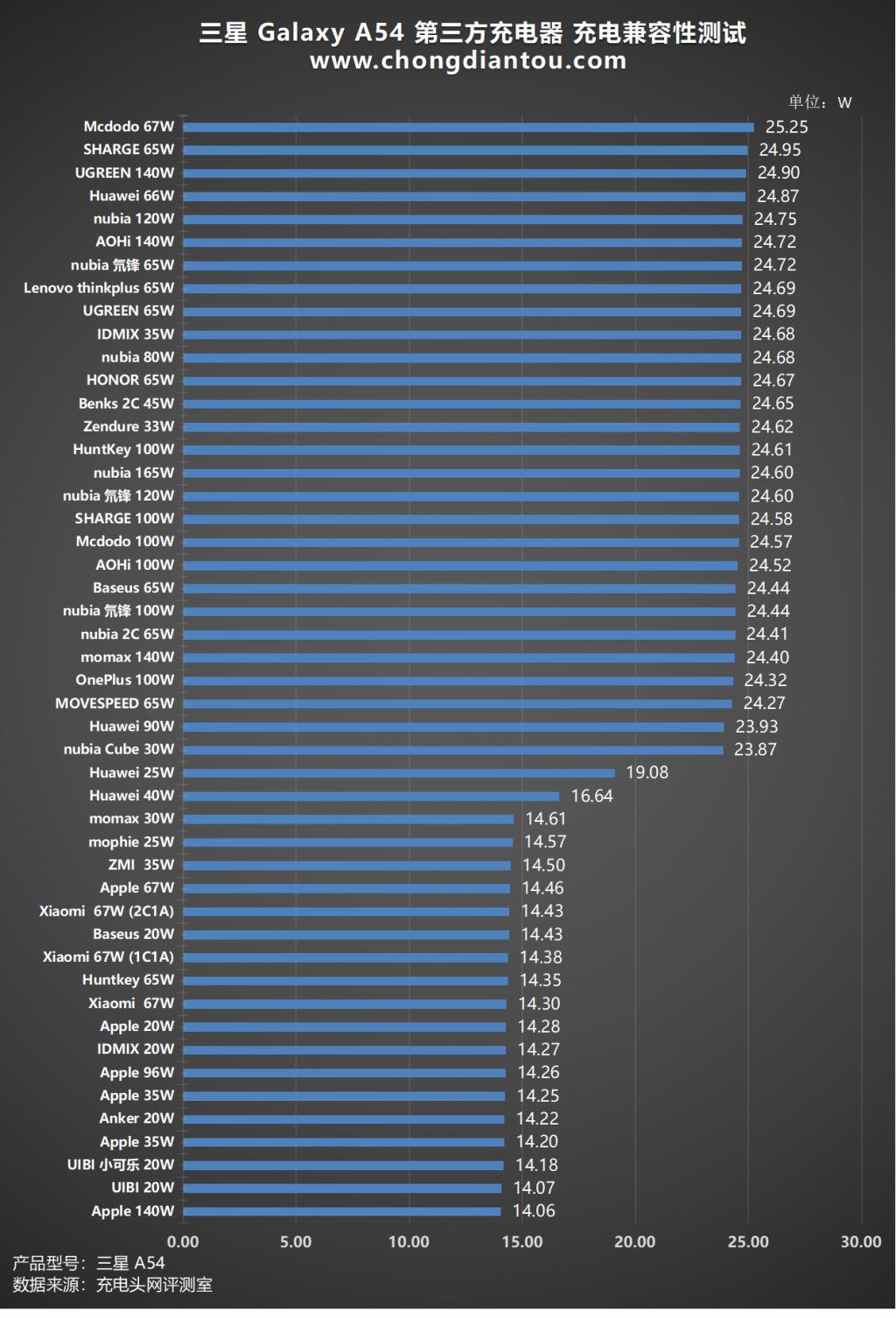 柱状图部分可以清楚的看出每款充电器充电功率的大小,本次所测试的第三方充电器的充电功率主要分为 14、24W 两个充电档位,其中充电功率最高的为 麦多多 67W 充电器达到 25.25W,整体来看 三星 Galaxy A54 的充电兼容性比较优秀,没有出现 10W 以下的低功率情况,近半的充电器能达到和原厂充电器同样的充电功率,能给大家带来良好的充电体验。