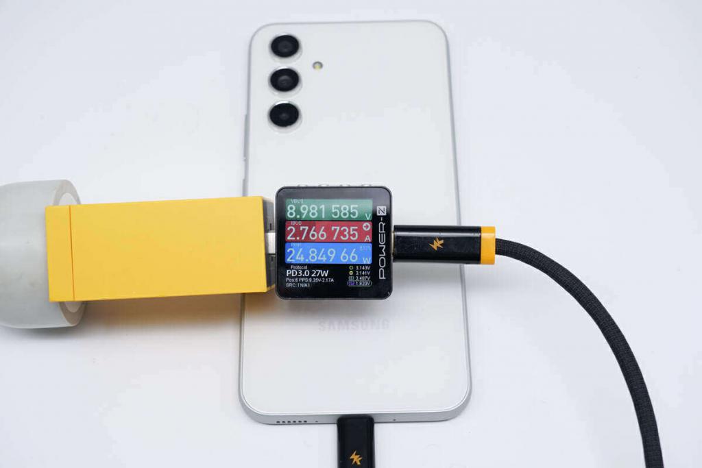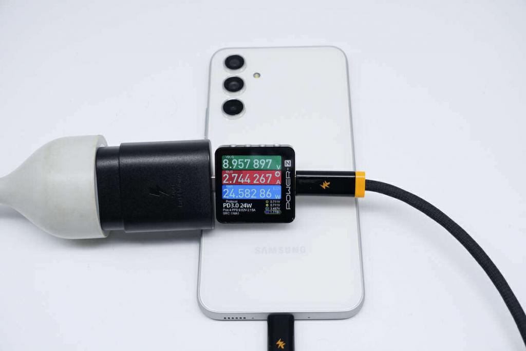 使用原厂充电器搭配第三方充电线为 三星 Galaxy A54 充电使用 POWER-Z KM003C 实测功率为 8.96V 2.74A 24.58W。