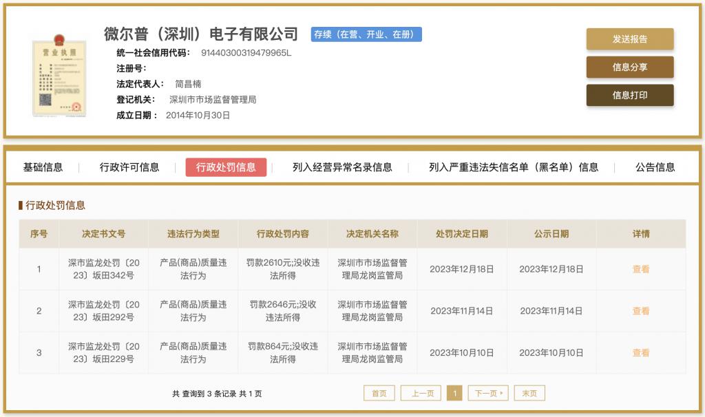 此外,关于产品质量问题也备受消费者关注。在 2023 年 10 月到 2023 年 12 月期间,微尔普公司因产品(商品)质量违法行为,接连三次被深圳市市场监督管理局龙岗监管局行政处罚。