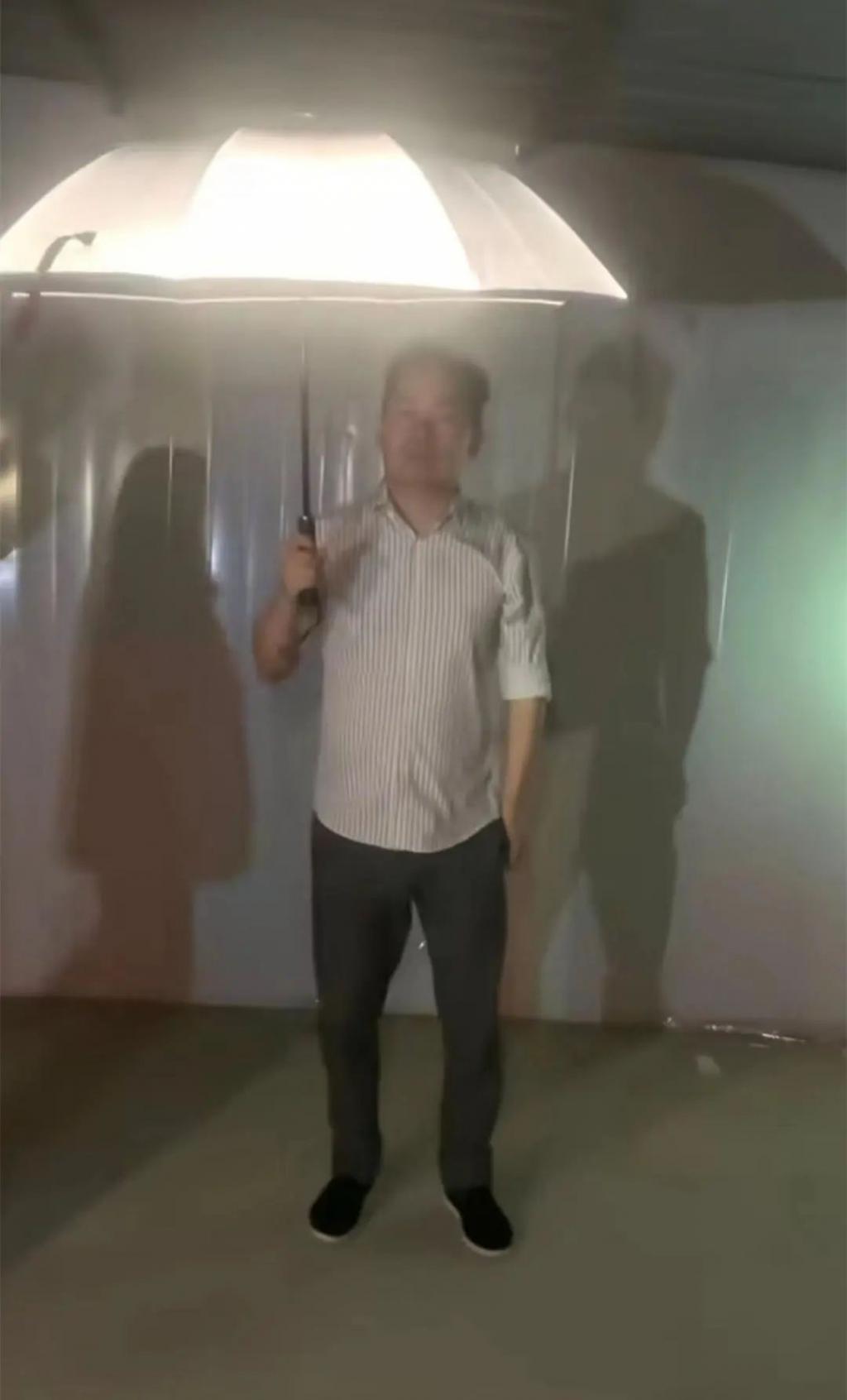 雷鹏琳使用 " 会下雨的伞 "。图源:视频截图