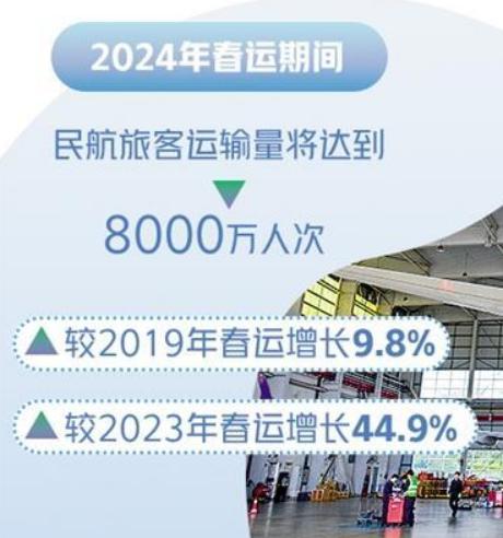 随着 2024 年春运大幕拉开,预计民航旅客运输量将达 8000 万人次,较 2019 年春运增长 9.8%,较 2023 年春运增长 44.9%,有望创历史新高。