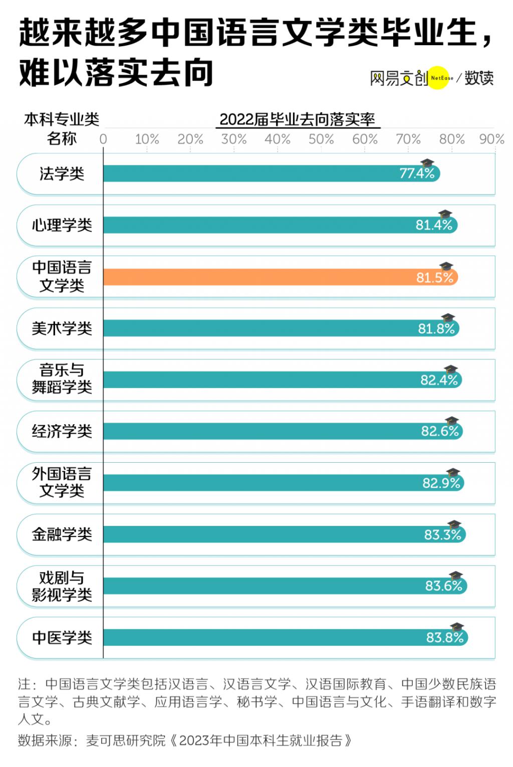 在本科专业目录中,汉语国际教育属于中国语言文学类 [ 5 ] 。麦可思研究院的调查显示,2022 届中国语言文学类本科生毕业后的落实率为 81.5%,位列倒数第三名,仅好于心理学类和法学类 [ 3 ] 。