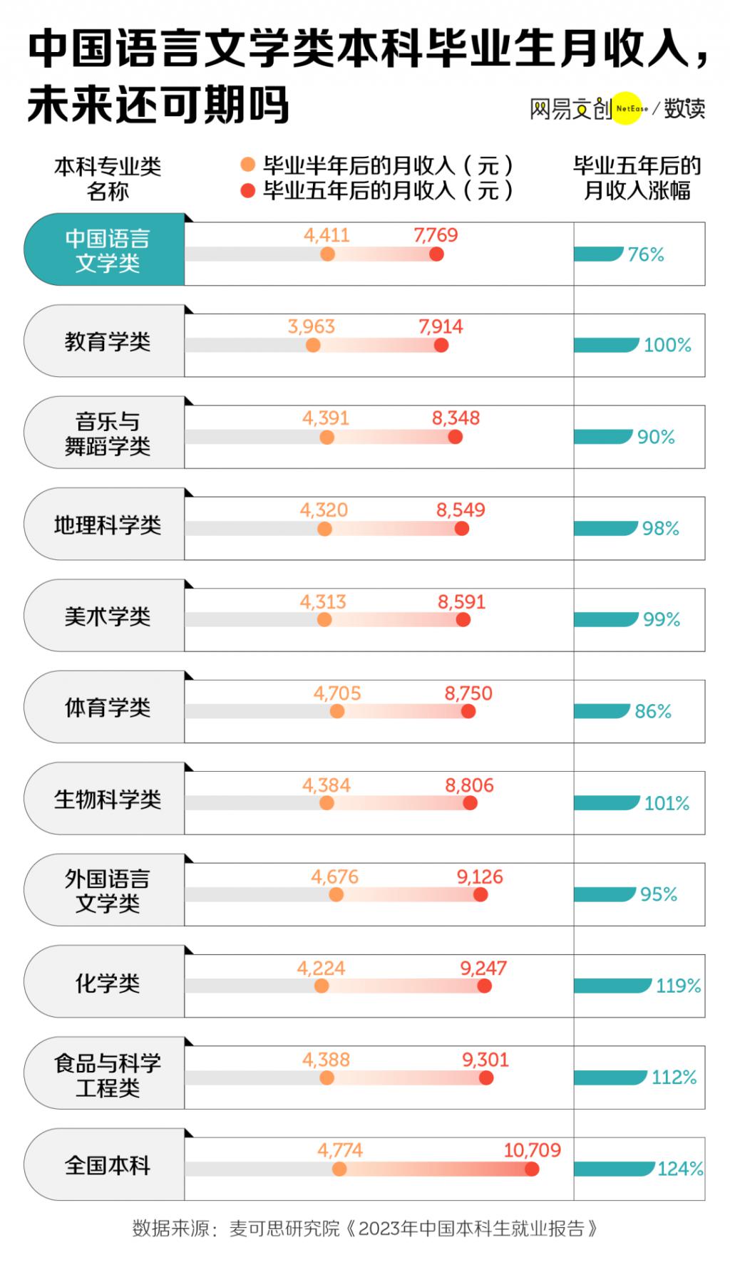 五年后,其他专业纷纷靠资历熬出头,而中国语言文学类还在龟速前进。不仅月收入吊车尾,五年来的月收入涨幅也只有 76%,妥妥的倒数第一。