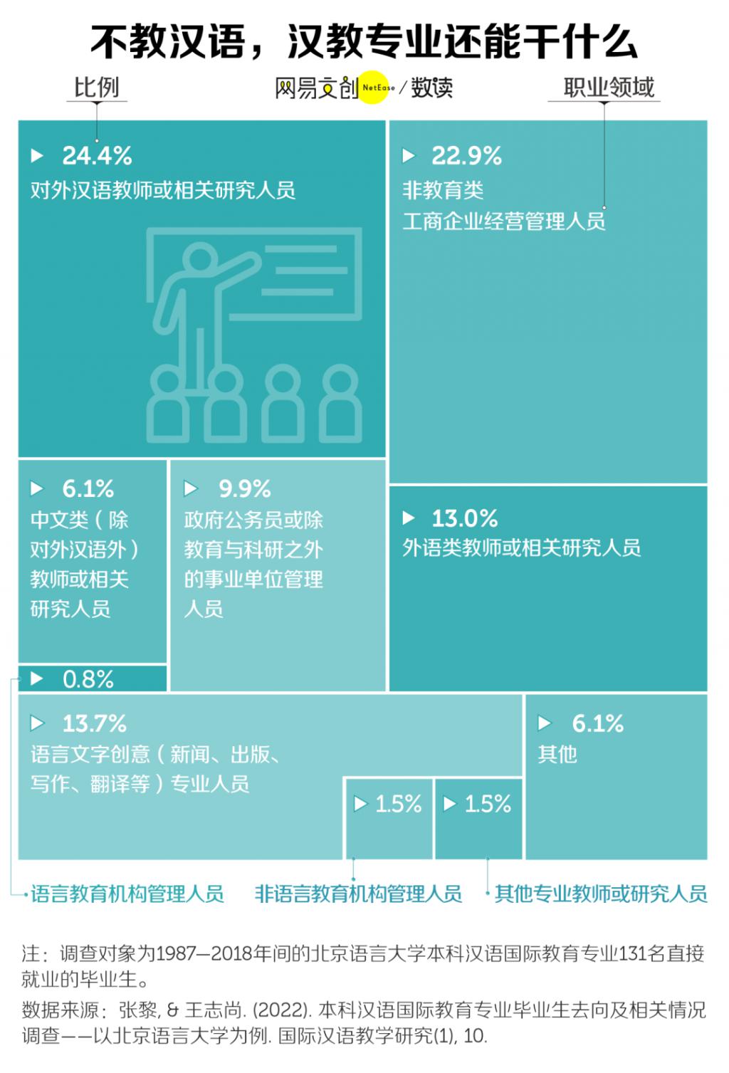 对口率较高的北京语言大学,1987-2018 年间毕业校友的专业对口率也只有 24.4% [ 9 ] 。在一些名气稍逊的双非院校,就业对口率可能更低。比如在浙江外国语学院已经毕业的 228 名汉语国际教育专业学生中,从事相关行业的比例只有 3.9% [ 10 ] 。