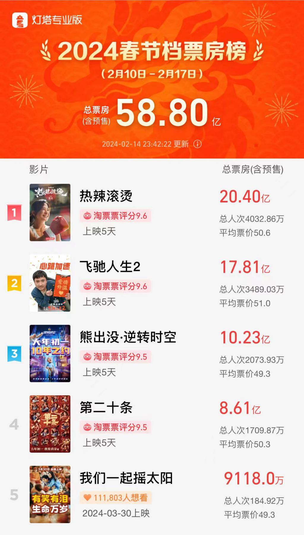 据灯塔专业版实时数据,截至 2 月 14 日 23 时 42 分,影片《第二十条》总票房(含预售)为 8.61 亿元,在 2024 春节档票房榜排名第四。前三名为《热辣滚烫》《飞驰人生 2》《熊出没 · 逆转时空》,总票房(含预售)分别为 20.40 亿元、17.81 亿元、10.23 亿元。