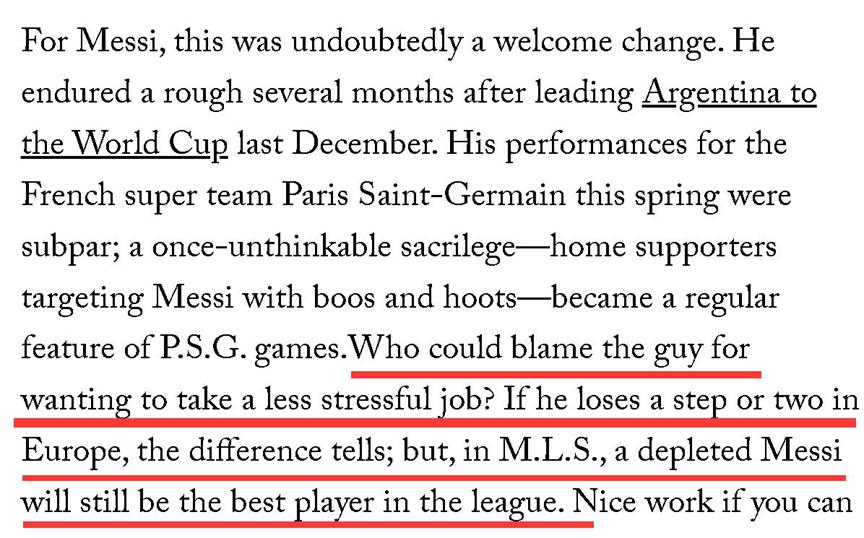 至于梅西个人层面,其实去年 7 月美国《纽约客》杂志曾在梅西开始在美国踢球后,写过一篇值得玩味的文章。从该文章的讲述来看,梅西之所以选择来美国踢球,似乎是因为美国的水平较低,他不会因为在欧洲踢球时那样,想划个水就被球迷嘘惨,甚至他就算划水,都可能仍然是这里的最佳。