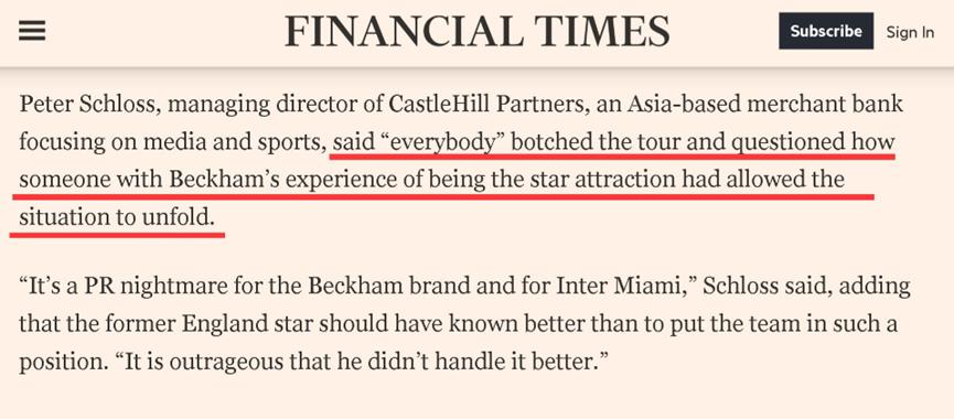 另一方面,《金融时报》该文章认为香港之行演砸是 " 每一个环节 " 都出了问题,并将更多的责任指向了迈阿密国际俱乐部,以及俱乐部的共同持有人、前英格兰球星贝克汉姆,认为以贝克汉姆的经验根本不该让事态发展成这样。