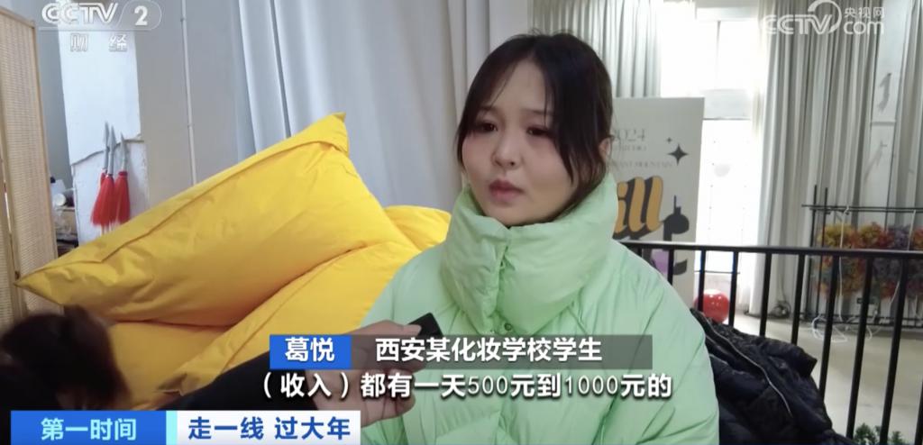 西安某化妆学校学生 葛悦:过年一天收入 500 元到 1000 元。