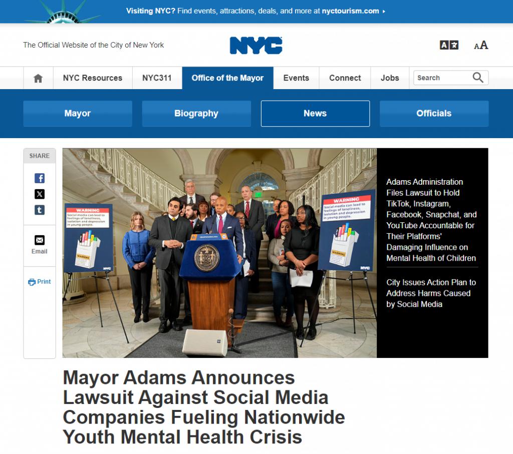 市长亚当斯称," 在过去十年间,网络世界具备的成瘾性可让我们的孩子不停接触有害内容,加剧了我国青少年心理健康危机。今天,我们代表数百万纽约市民采取了大胆的行动,让这些公司为他们在这场危机中扮演的角色负责,我们将继续努力解决这一危害公共健康的问题。"