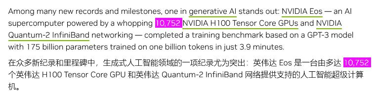 Eos 是由 10752 块英伟达 H100 Tensor Core GPU 和英伟达 Quantum-2 InfiniBand 网络构建的人工智能超级计算机,创造了诸多新的纪录和里程碑。