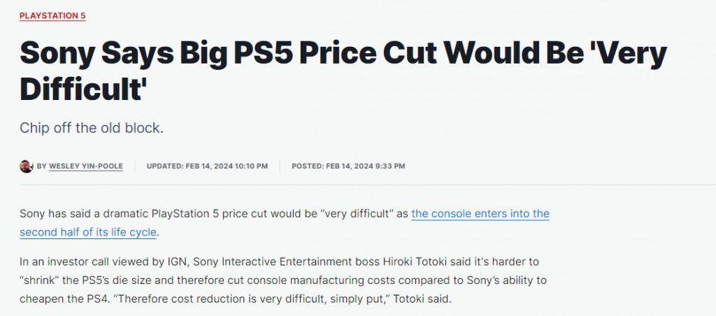 据 IGN 报道,十时裕树对此给出的一个原因是 " 芯片尺寸 ",与同等成本的上一代产品相比,缩小其芯片尺寸的成本相对较高。" 与降低 PS4 的成本相比,缩小 PS5 芯片尺寸从而降低制造成本的难度更大。简单来说,降低成本非常困难。"