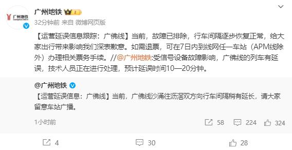 上午 9 时许,@广州地铁 发布最新情况:当前,故障已排除,行车间隔逐步恢复正常,给大家出行带来影响我们深表歉意。如需退票,可在 7 日内到线网任一车站(APM 线除外)办理相关票务手续。