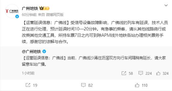 今天 8 时许,@广州地铁 发布运营延误信息:受信号设备故障影响,广佛线的列车有延误,技术人员正在进行处理,预计延误时间 10 — 20 分钟。有急事的乘客,请从其他线路绕行或改乘其他交通工具,所持车票 7 日之内可到除 APM 线外地铁各站办理相关票务手续。