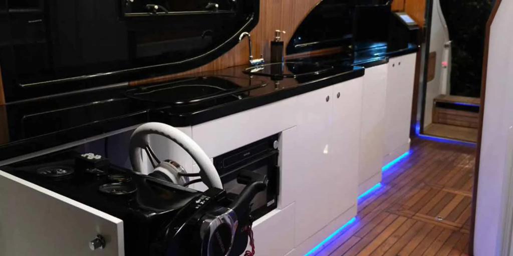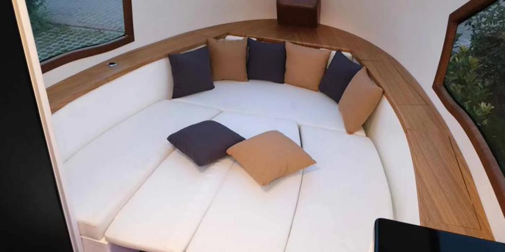 在水上航行时,Sealvans 采用了单体式船体结构,并辅以不锈钢铬合金装饰。内部空间则采用人造或真柚木材质打造,并配备齐全的生活设施,例如电炉灶、18 升冰箱、双腔燃气烤箱等。可伸缩的桌椅搭配减震床脚和符合人体工学的床垫(一张单人床和一张双人床),以及配备淋浴间和船用抽水马桶的防水浴室,让旅途更加舒适惬意。