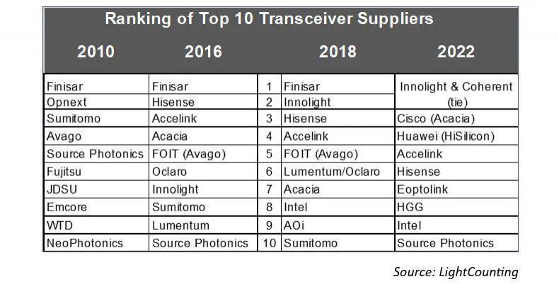 据光通信市场机构 LightCounting 的统计,在 2022 年全球光模块市场,旭创与美国 Coherent 并列第一。