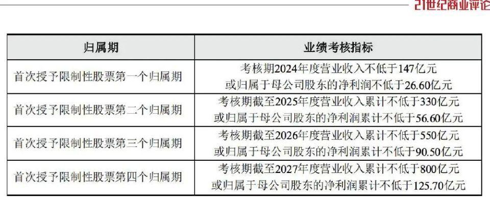其中,2024 年度的考核期,公司营收不低于 147 亿元,或净利润不低于 26.6 亿元,2025 年的目标,是在此基础上翻倍。
