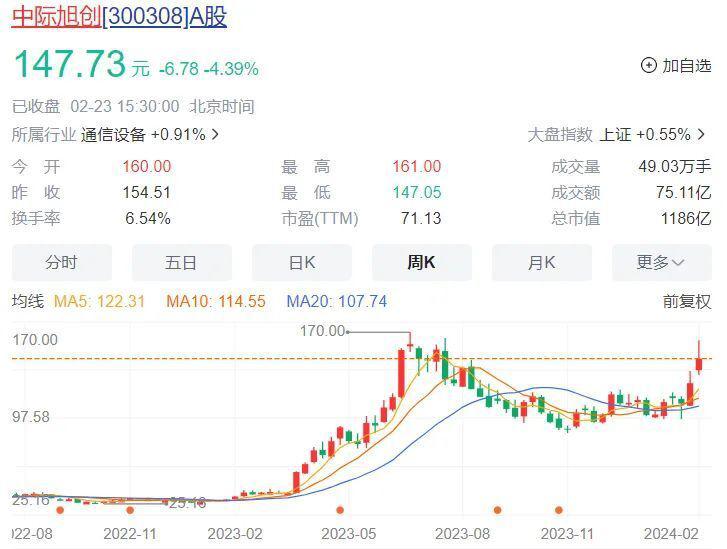 2 月 23 日,英伟达的市值,站上约 2 万亿美元,中际旭创也在 1200 亿人民币左右。