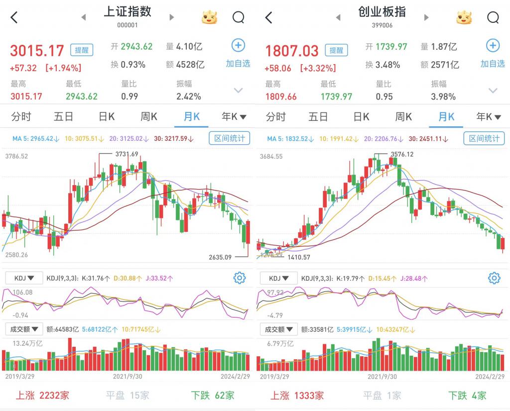 至 2 月 29 日收盘,上证综指涨 1.94%,报 3015.17 点;科创 50 指数涨 4.68%,报 807.71 点;深证成指涨 3.13%,报 9330.44 点;创业板指涨 3.32%,报 1807.03 点。