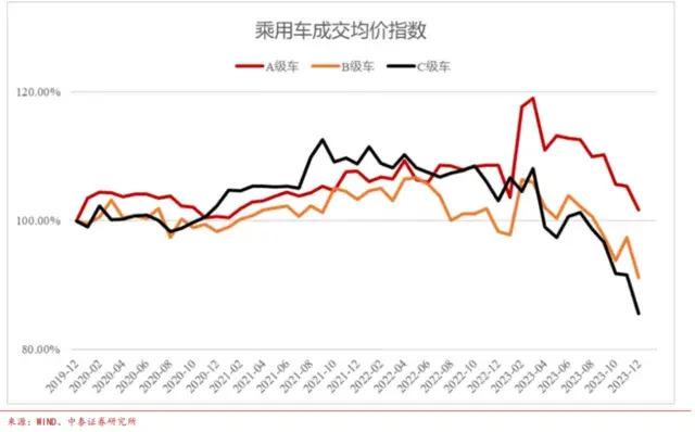 一个例证是,中泰证券最近的一份研报显示,从 2019 年末到 2023 年末,虽然乘用车的月销量大致保持上升,但成交均价从 23 年 3 月达到高点后,在半年时间内重新掉落到 2019 年年末的低水平。(来自 Autocarweekly 文章《「向上」,国产车面临的诱人陷阱》)