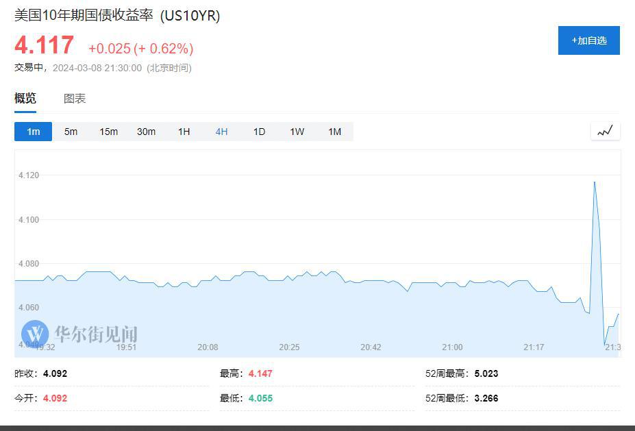 数据发布后,美元指数短线下挫约 20 点,报 102.47。美国 10 年期国债收益率短线拉升约 6 个基点后迅速走低约 7 个基点,报 4.117%。美股期货短线拉升,纳斯达克 100 指数期货转涨。现货黄金短线拉升逾 10 美元,报 2180.81 美元 / 盎司,续创历史新高。