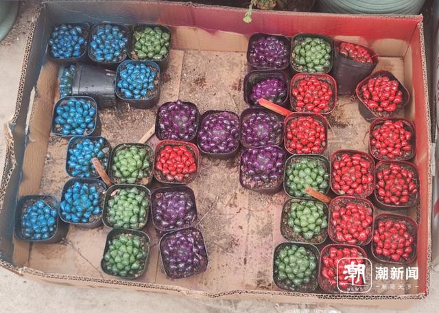 在一家主营多肉植物的店铺内,记者发现了 " 炫彩多肉 " 的身影,蓝色、红色、紫色、绿色都有。但记者拿起盆栽闻了闻,并未闻到刺鼻的油漆味。