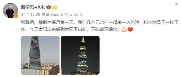 【CNMO 科技消息】据 CNMO 了解,小米一众高管近期频频现身海外市场。小米集团合伙人、总裁,国际部总裁,小米品牌总经理卢伟冰发微博表示,终于完成了巴塞罗那 - 马德里 - 拉各斯 - 开罗 - 利雅得的出差。有意思的是,小米集团高级副总裁、手机部总裁曾学忠还在利雅得体验了穆斯林的斋月礼仪。
