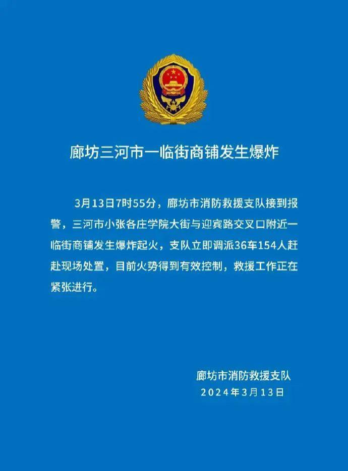 另据 @廊坊消防 消息:3 月 13 日 7 时 55 分,廊坊市消防救援支队接到报警,三河市小张各庄学院大街与迎宾路交叉口附近一临街商铺发生爆炸起火,支队立即调派 36 车 154 人赶赴现场处置,目前火势得到有效控制,救援工作正在紧张进行。