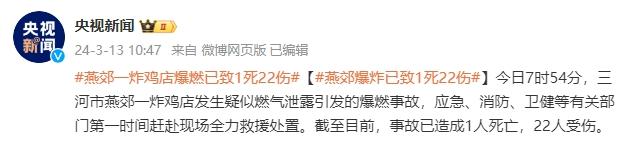 据央视新闻消息,3 月 13 日 7 时 55 分许,河北省廊坊三河市燕郊小张各庄村一老小区底商餐饮店发生爆炸,现场响声巨大。截至上午 10 点 40 分,事故已造成 1 人死亡,22 人受伤。