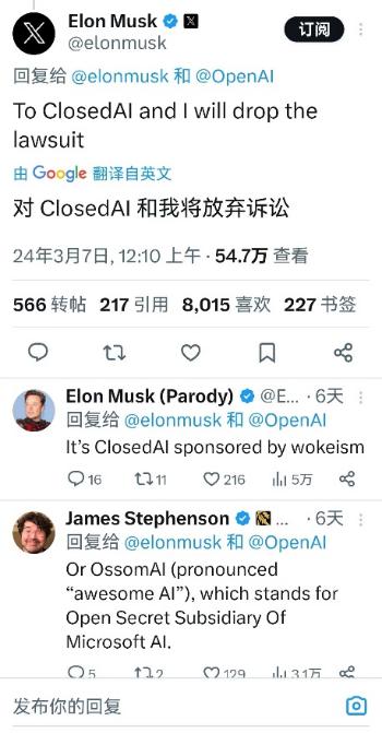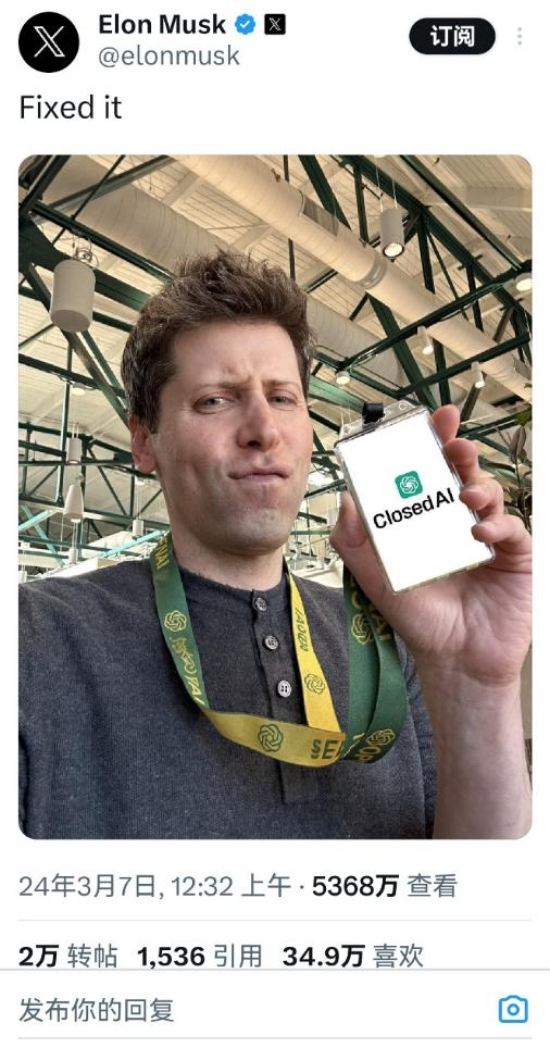 在和 Sam 一番口水战后,马斯克甚至说,只要 OpenAI 改名成 ClosedAI,他就撤诉。