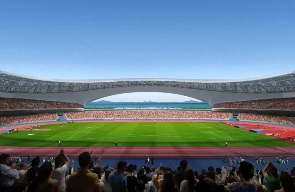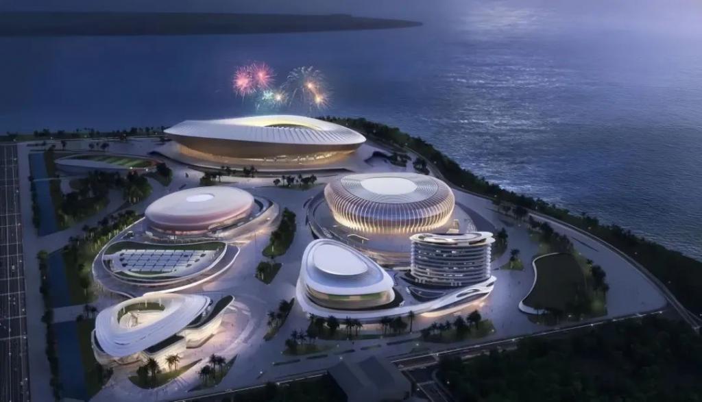 项目建设内容包括综合体育馆、游泳跳水馆两个甲级综合体育场馆,运动员中心及相关配套工程,各场馆布局依海而生,如夜明珠般沿海岸展开。
