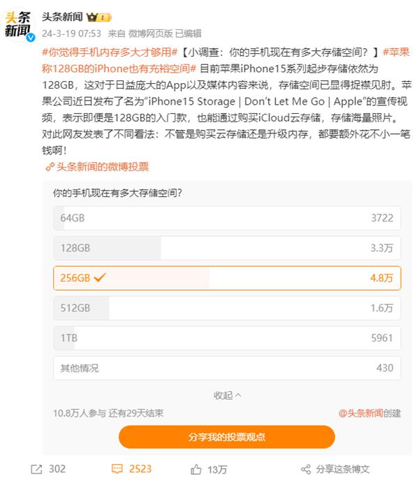 根据媒体投票,截稿前,共有 10.8 万人参与投票,选择 256GB 的有 4.8 万人,128GB 有 3.3 万人,1TB 为 5961 人。