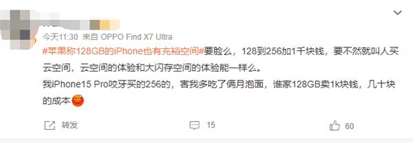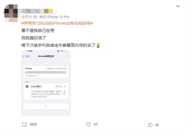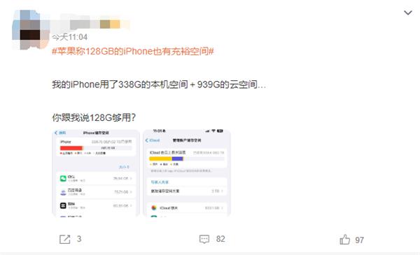 有网友和博主表示," 我的 iPhone 用了 338G 的本机空间+939G 的云空间…你跟我说 128G 够用?"" 要不是我自己在用我就真的信了 "" 要脸么,128 到 256 加 1 千块钱,要不然就叫人买云空间,云空间的体验和大闪存空间的体验能一样么。" 等等。