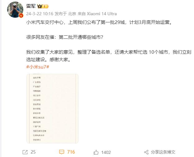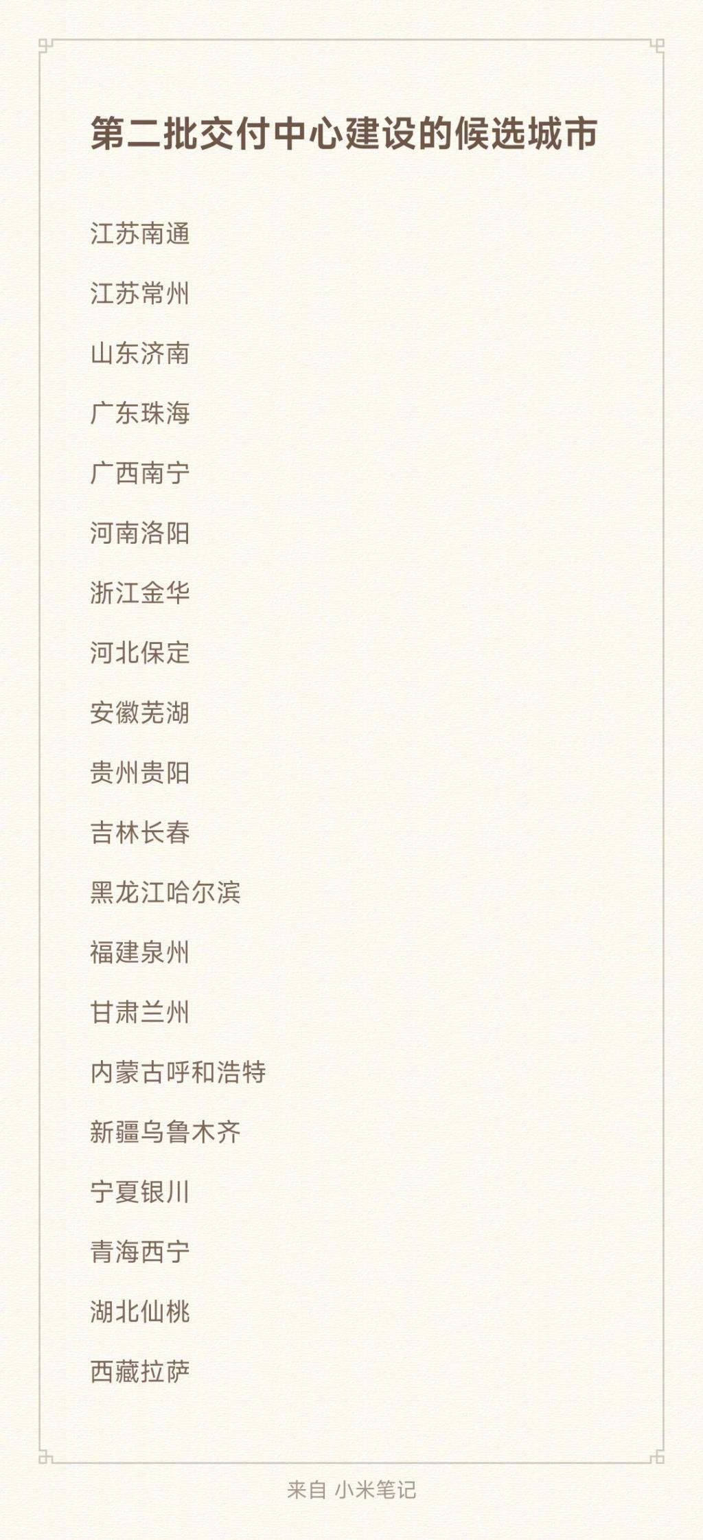 雷军公布第二批小米汽车交付中心城市候选名单,投票选出10个城市