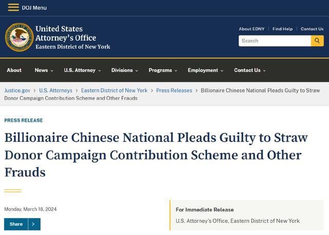 据美国纽约东区检察官办公室官方网站 3 月 18 日发布的新闻稿,中国籍亿万富豪覃辉承认了其以他人名义政治献金、移民欺诈和制作虚假身份证明文件的罪名。
