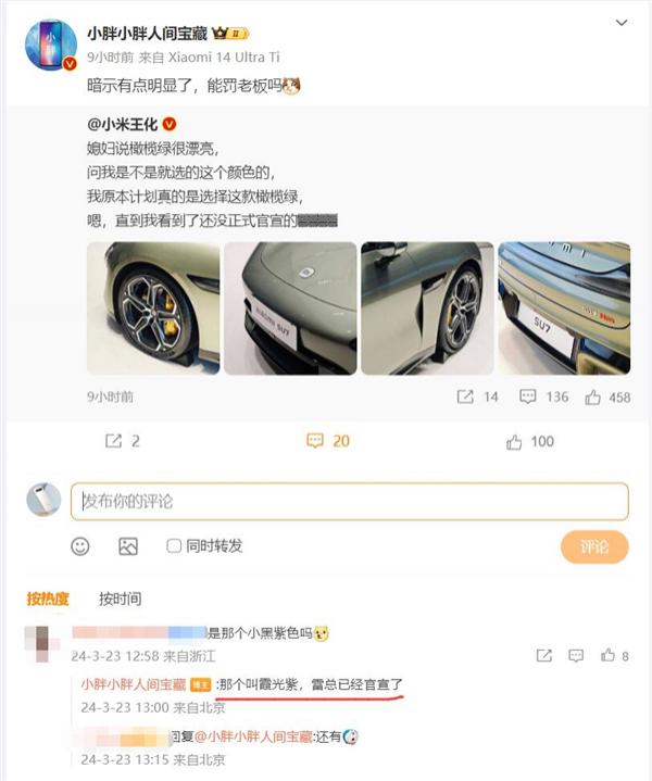 快科技 3 月 23 日消息,小米集团的王化暗示,小米 SU7 即将推出新的车身颜色,而小米创办人雷军将在 3 月 28 日新品上市发布会上正式揭晓这一新颜色。
