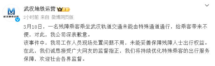 3 月 18 日,一名残障乘客乘坐武汉轨道交通未能由特殊通道通行,给乘客带来不便,对此,我公司深表歉意。